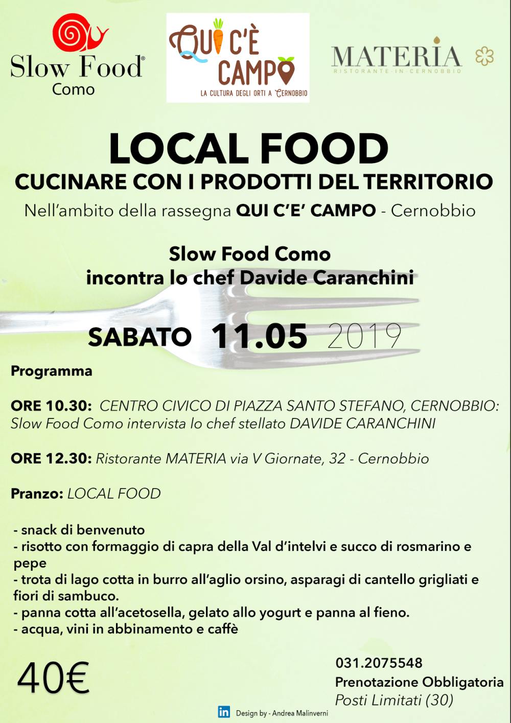 Carissimi soci è simpatizzanti ecco i dettagli precisi della nostra partecipazione al “QUI C’È CAMPO – Cernobbio”. Se interessati affrettatevi a prenotare il Pranzo: LOCAL FOOD al MATERIA di Davide Caranchini chef stellato che ha ideato un Menù inedito di lago e monti del territorio lariano studiato in sintonia ed esclusiva per noi di Slow Food di Como.