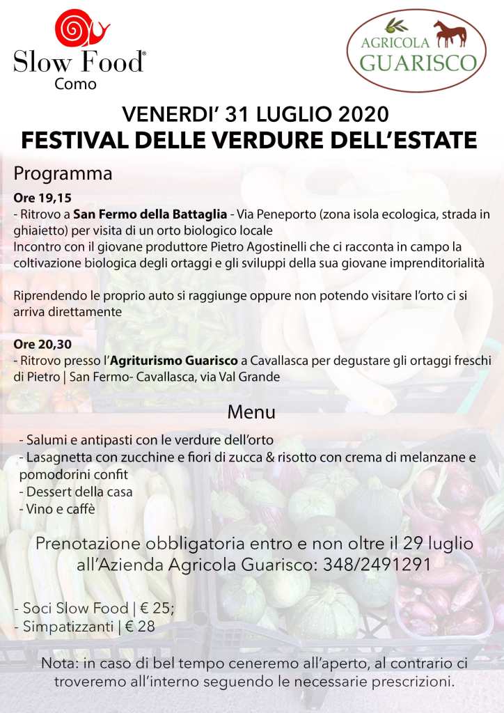 Carissimi soci e simpatizzanti, nuovo evento formativo gastronomico: Festival delle Verdure dell’ Estate. Venerdì 31 luglio 2020 alle ore 19,30 visita all’orto biologico di Pietro Agostinelli (San Fermo della Battaglia via Peneporto) con illustrazione in campo della coltivazione biologica. A proseguire (chi volesse giungere direttamente può farlo) alle ore 20.30 Cena con degustazione di ortaggi freschi presso Agriturismo Guarisco Cavallasca in via Val Grande con gustoso menu proposto dall’orto di Pietro. Vi aspettiamo calorosamente anche a questo nuovo incontro!