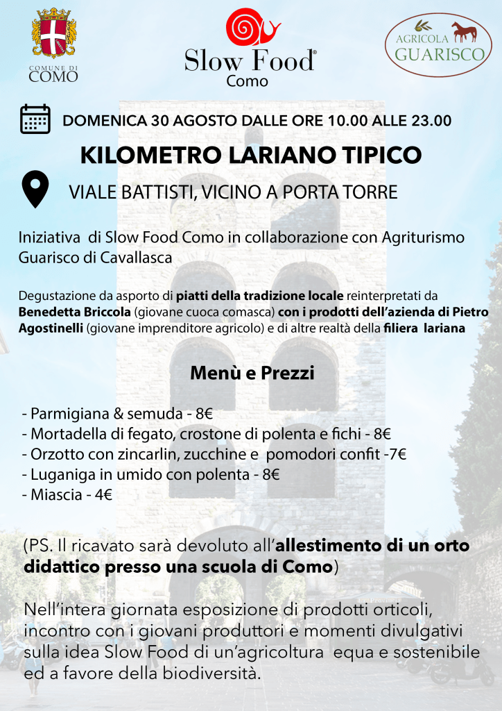 Possibilità degustazione di piatti cucinati da Agriturismo Guarisco con i prodotti di Pietro Agostinelli. Tutti i ricavati saranno devoluti all’allestimento di un orto didattico presso una scuola di Como.