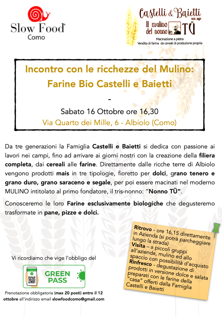 Nuovo imperdibile appuntamento alla scoperta delle farine BIO prodotte dalla storica azienda Castelli e Baietti di Albiolo. Pietro Castelli, il giovane responsabile , ci guiderà nella visita dell’azienda agricola, lungo un percorso che ci porterà a conoscere le fasi della produzione e il Mulino; per finire una speciale degustazione dei prodotti dell’azienda che potranno anche essere acquistati singolarmente.