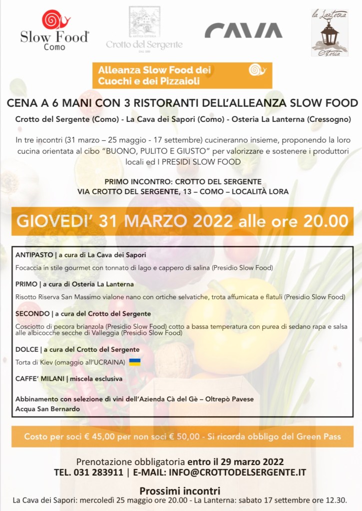 E quindi, come presentare al meglio il progetto se non organizzando, nello spirito dell’Alleanza, uno speciale percorso di cene a 6 mani, che vedrà alternarsi ai fornelli 3 cuochi lariani dell’alleanza (Crotto del Sergente, La Cava dei Sapori, e Osteria la Lanterna)! Tre eccellenze comasche che cucineranno insieme, proponendo la loro cucina orientata al cibo “buono, pulito e giusto”!