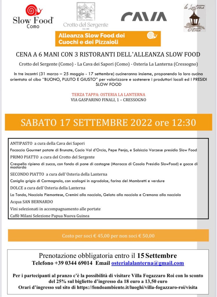 riprendono le nostre iniziative con il pranzo di Sabato 17 settembre, ore 12.30, che si terrà presso il ristorante Osteria La Lanterna a Cressogno – Valsolda (CO), terzo ed ultimo appuntamento del progetto dell’ ”Alleanza Slow Food dei Cuochi e dei Pizzaioli”: un’alleanza stretta tra cuochi e piccoli produttori per salvaguardare la biodiversità e promuovere i cibi del territorio, buoni, puliti, giusti.