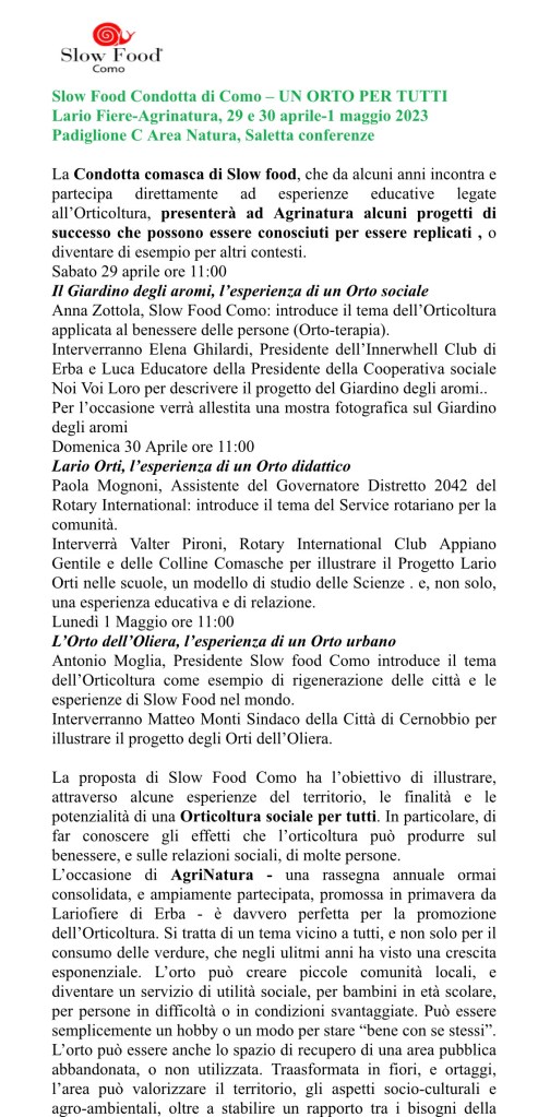 Carissimi amici soci e simpatizzanti, vi annunciamo che saremo presenti ad Agrinatura a LarioFiere (Erba, Como), dal 29 aprile al 1 maggio, con lo stand di Slow Food Como, che ospiterà alcuni selezionati agricoltori.
