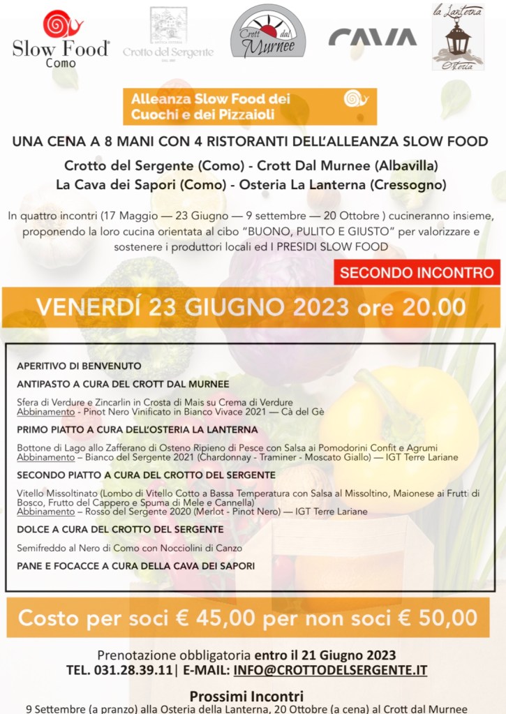 Abbiamo organizzato uno speciale percorso di cene a 8 mani, che vedrà alternarsi ai fornelli 4 cuochi lariani dell’alleanza (Crotto del Sergente, Crott dal Murnee, La Cava dei Sapori, e Osteria la Lanterna)! Quattro eccellenze comasche che cucineranno insieme, proponendo la loro cucina orientata al cibo “buono, pulito e giusto”!