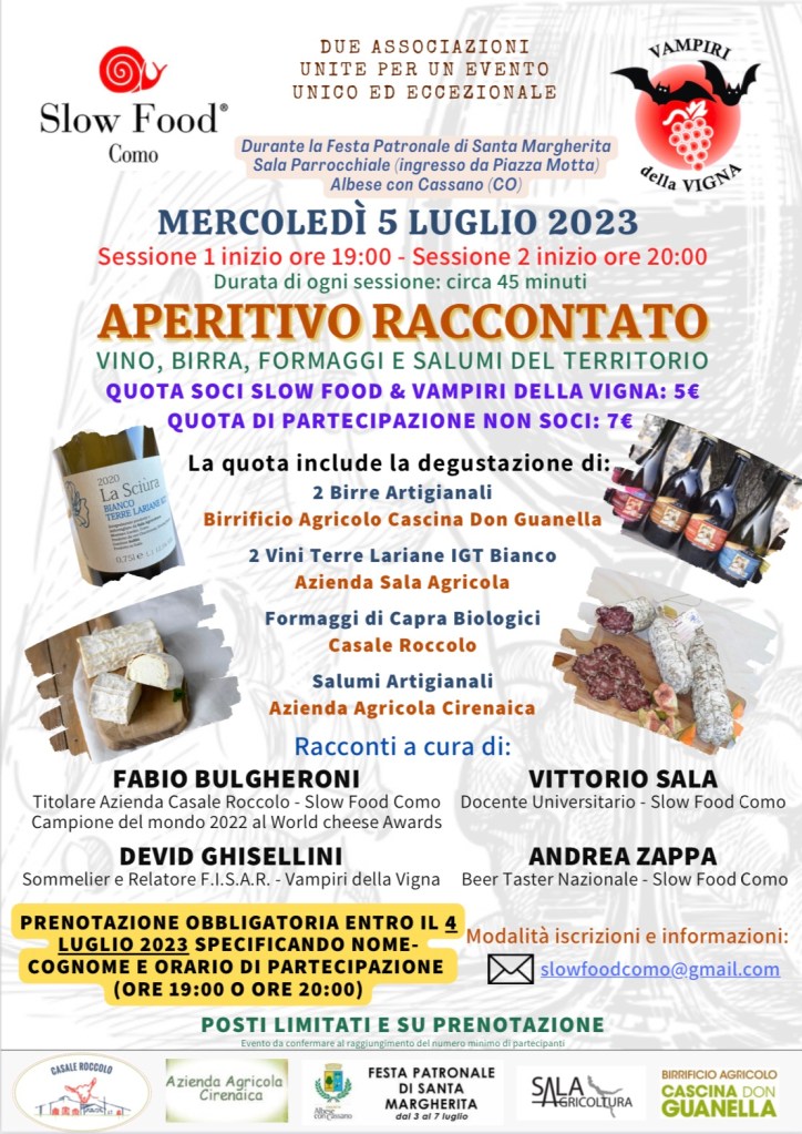 Saremo presenti con SLOW FOOD IN PIAZZA un ricchissimo programma con appuntamento principale alle 19.00 ed alle 20.00 con l’APERITIVO RACCONTATO, un laboratorio di degustazione di vini e birre con formaggi e salumi, che è un “vero ricco aperitivo” raccontato dai produttori e dagli esperti intenditori: Vittorio Sala (salumi), Fabio Bulgheroni (formaggi), Devid Ghisellini (vini) ed Andrea Zappa (birre).