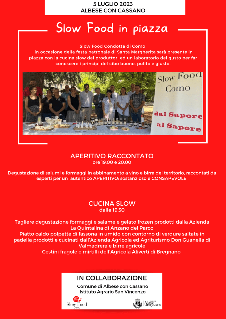 Saremo presenti con SLOW FOOD IN PIAZZA un ricchissimo programma con partenza alle 19.00 e successivamente alle 20.00 con l’APERITIVO RACCONTATO, un laboratorio di degustazione di vini e birre con formaggi e salumi, un “vero ricco aperitivo” raccontato dai produttori e da esperti intenditori, e conla CUCINA SLOW dalle ore 19.30 dell’Aziende Agricole Don Guanella, Quintalina e Aliverti con un’offerta gustosa di piatti pronti e frutta preparati con le proprie produzioni e descritti nell’allegata locandina.
