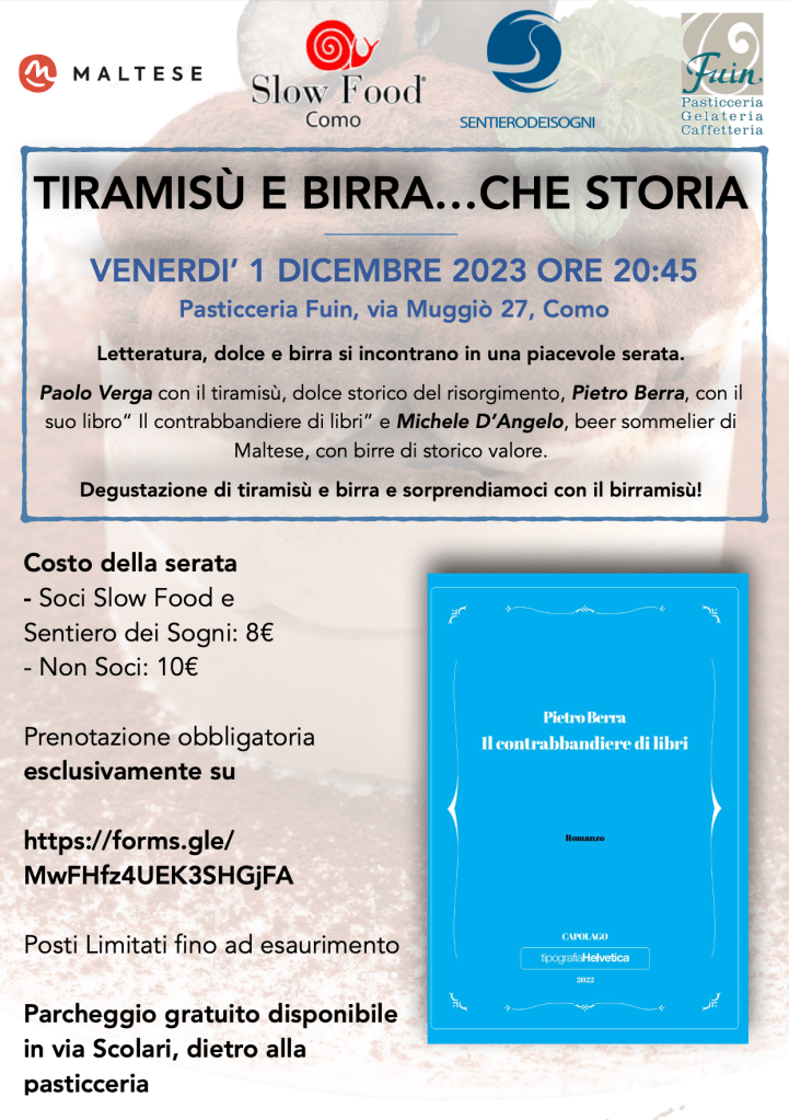 il prossimo venerdì 1° dicembre alle ore 20.45 appuntamento con TIRAMISU’ E BIRRA … CHE STORIA un goloso e curioso incontro di letteratura, piacere e birra artigianale. Interverrà Pietro Berra, giornalista e scrittore che nel libro “il contrabbandiere di libri” su Luigi Dottesio racconta dell’inedito storico legame lariano con il dolce. Il maestro pasticcere Paolo Verga titolare della Pasticceria Fuin in via Muggiò 27 a Como ci descriverà la tecnica di preparazione e ci delizierà con dolci assaggi.