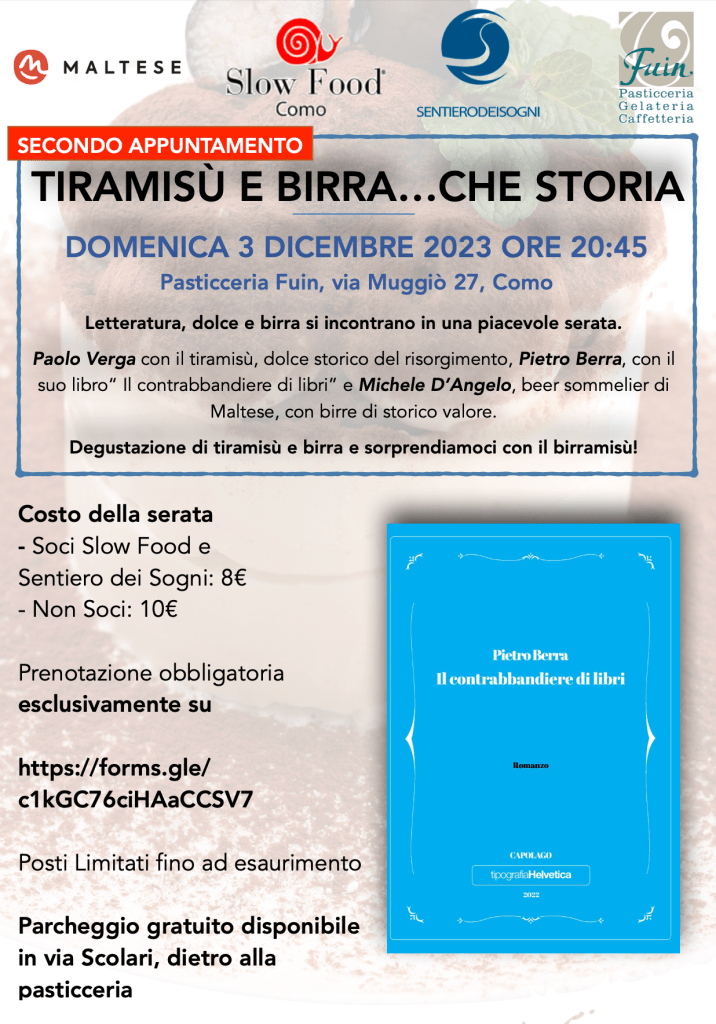 la prossima domenica 3 dicembre alle ore 20.45 a grande richiesta ritorna l’appuntamento con TIRAMISU’ E BIRRA … CHE STORIA un goloso e curioso incontro di letteratura, piacere e birra artigianale. Interverrà Pietro Berra, giornalista e scrittore che nel libro “il contrabbandiere di libri” su Luigi Dottesio racconta dell’inedito storico legame lariano con il dolce. Il maestro pasticcere Paolo Verga titolare della Pasticceria Fuin in via Muggiò 27 a Como ci descriverà la tecnica di preparazione e ci delizierà con dolci assaggi.