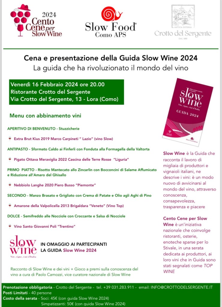 La Condotta Slow Food di Como invita soci e simpatizzanti ad una serata speciale, venerdì 16 febbraio, al Crotto del Sergente: 100 Cene per Slow Wine 2024!