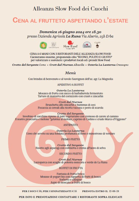 Nel piacevole e rilassante contesto agreste del frutteto della Azienda Agricola LA RUNA, la Condotta SLOW FOOD COMO APS organizza una cena a sei mani preparata dai Cuochi