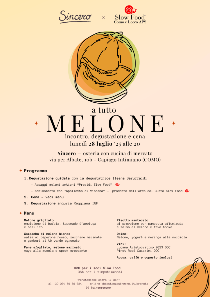 Carissimi amici soci e simpatizzanti, appuntamento estivo in collaborazione con Slow Food Oglio Po, dedicato alla conoscenza del Melone e … non solo, quello del prossimo lunedì 28 alle ore 20.00 al Sincero di Capiago Intimiano nel fresco dehors all’aperto (tempo permettendo).