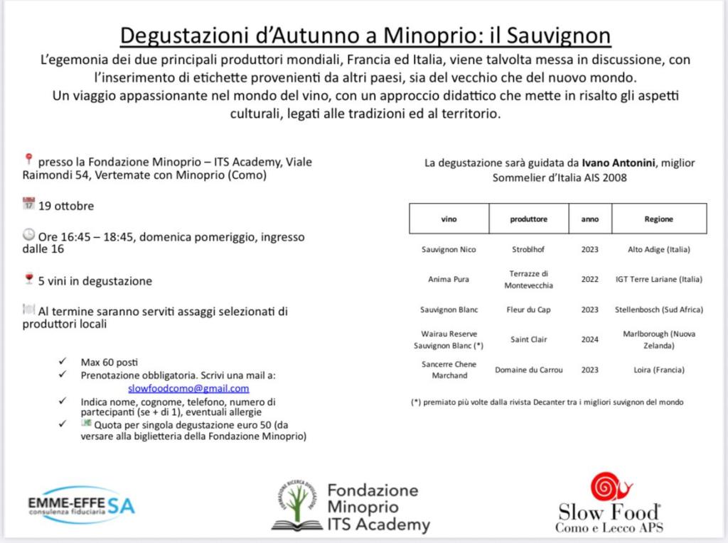Slow Food Como e Lecco vi aspetta nelle sale nobiliari della Villa Raimondi presso la Fondazione Minoprio per degustare cinque tipologie di Sauvignon.